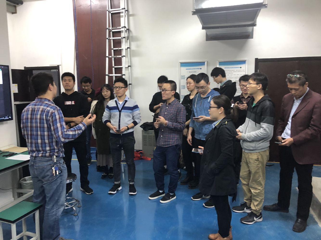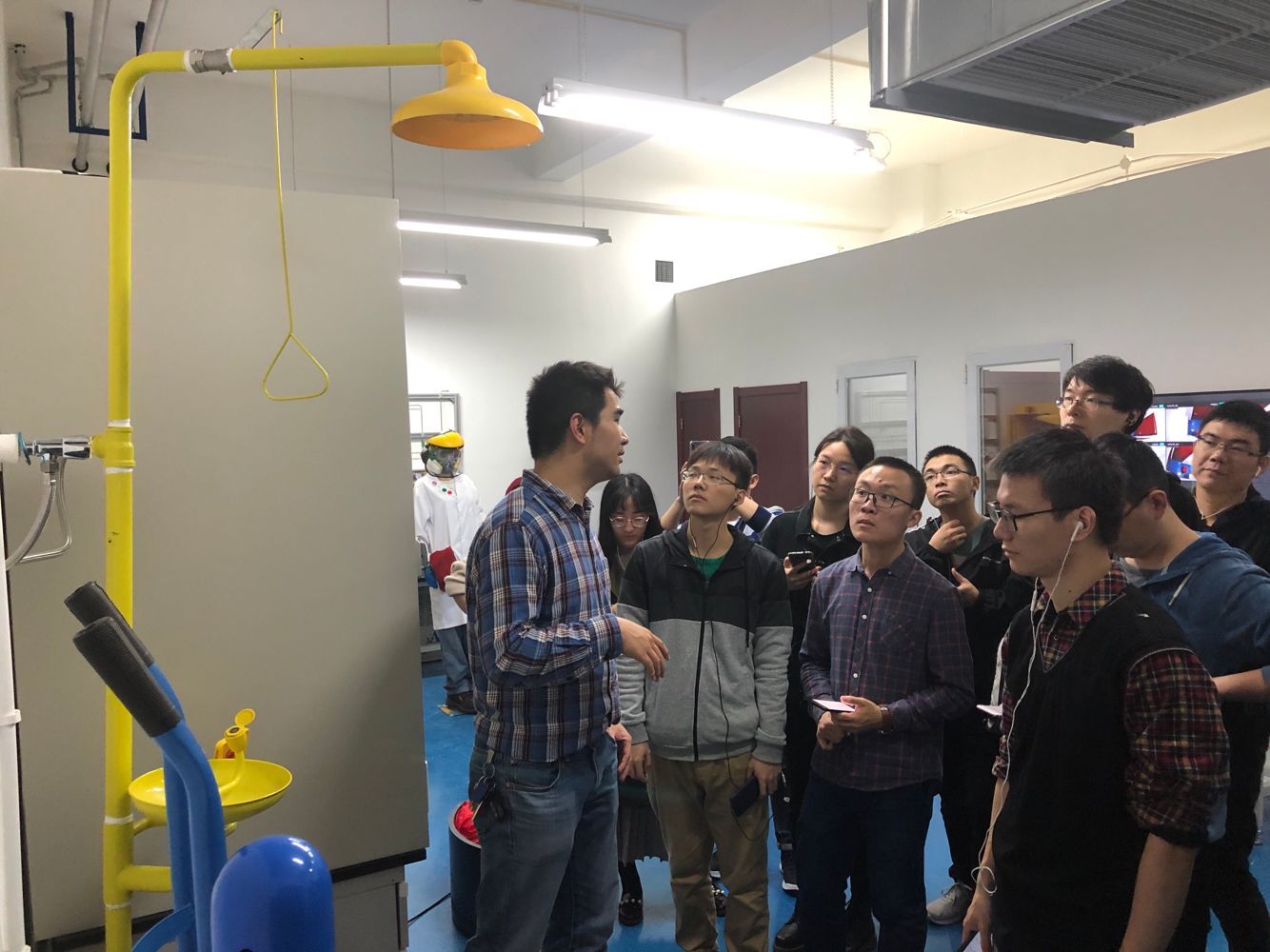 在完成APP中的学习之后,老师同学们分别进行了“循环水系统检查”、“腐蚀性溶液洒落处理”、“消防逃生”、“高空逃生”等情况的模拟演练。在演练中同学们把从APP学到的知识立即进行了运用,资产管理处的张展铭老师对同学们的操作进行点评指出了同学们操作中值得肯定及忽视的地方。