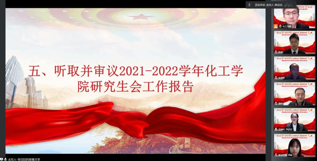研究生会工作报告,从强化同学思想引领、服务学生成长成才、文体活动丰富生活、志愿服务共同抗疫四大方面进行了详细汇报,并表示在新的历史起点上,学院研究生会将继续努力,汇聚起化工人的青春力量。全体与会代表审议通过。